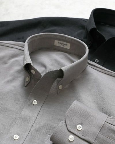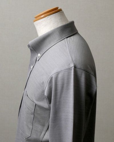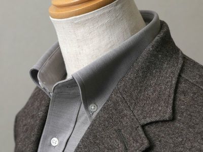 デザインは、襟型はボタンダウン、前立てはブラケットフロント、ショルダーデザインはセットインという、ベーシックなデザインにすることで、着こなしやすくお仕立てしました。