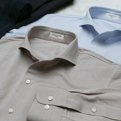 クールビズなどのノーネクタイスタイルでも首元が美しく見えるように、衿型は「カッタウェイ」にしました。