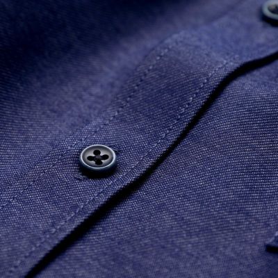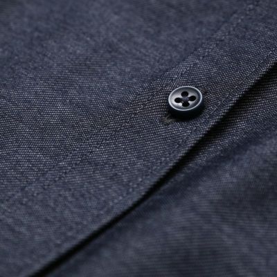 前立ては、トラッドなデザインのプラケットフロント(表前立て)。定番のドレスシャツよりもほんの少し前立てを細くしているので、シャツ1枚スタイルや、ジャケットOFFで着用した時に、スタイリッシュな印象に見えるデザインにしています。