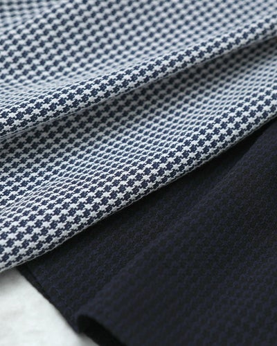 ネイビーとブラックの千鳥柄は、落ち着きのあるトーンの中に奥行きと陰影を感じさせる組み合わせです。どちらも深みのある色味同士でありながら、光の角度で現れるさりげないコントラスト。無地のようで、よく見ると柄が浮かび上がる——そんな“静かな個性”が、印象に深みを加えます。