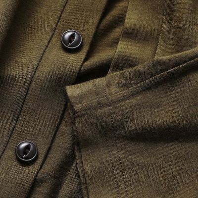 ビジネスシーンに合うカーディガンにするためには、ほど良いハリ感・艶感は欠かせません。そこで、高級素材「JAMES JERSEY」のスーパーファインウール100%で、72番手双糸のきめ細かい天竺編みで、目を細くハイゲージに編み上げた生地で、お仕立てしました。