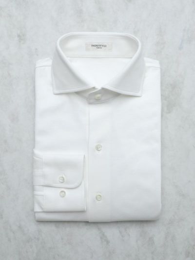 襟型は、ドレスシャツらしい「ワイド」にしています。ネクタイの収まりもよく、やさしい着心地からは想像できないようなきっちりした印象に見せてくれます。