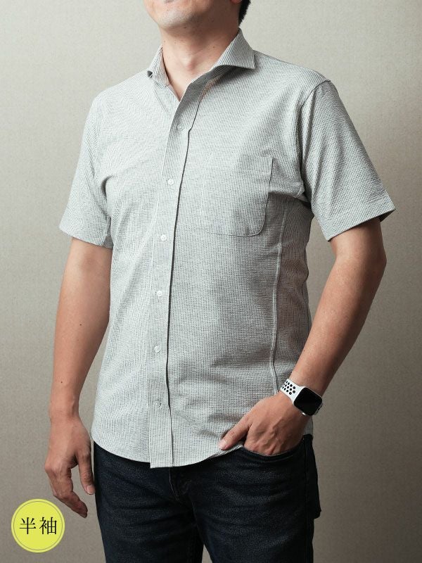 夏の人気素材「シアサッカー」で、半袖シャツをお仕立てしました。シアサッカー生地は、細かな凹凸があるので、肌にベタつかず、梅雨時期も本格的に暑い夏も涼しく過ごせる、夏にぴったりの素材です。