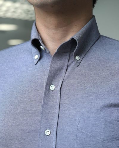 襟型は、ノーネクタイでも襟元がきれいに見える「ボタンダウン」にしました。シャンブレー生地で、“きれいめのデニム”のように着こなせるので、ノーネクタイスタイルも似合います。