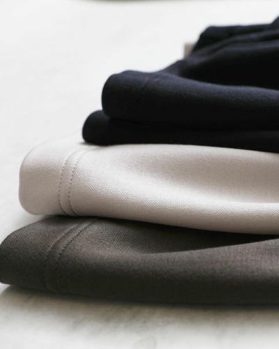 やわらかくふんわり編み上げた生地にシルケット加工を施すことで、ちょっとした外出にも対応できるような光沢感をプラスしました。
