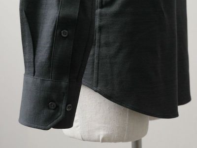 カフスは、手首のフィット感を調整できるように、ボタンを2つ付けた「アジャスタブルカフス」に。スマートな印象になるように、直線的に角をカットした「バレルカット」にしています。