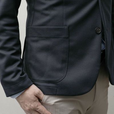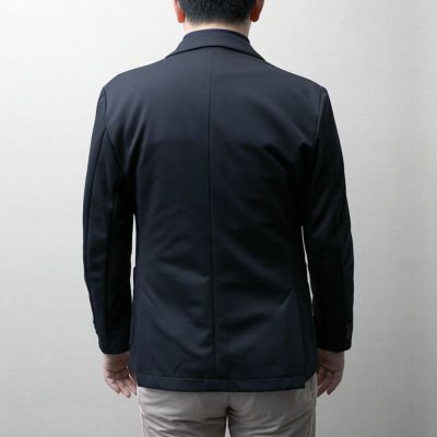そんなジャケットをお仕立てするために欠かせなかったのが、特許技術『動体設計』、そして世界三大ウールと称される『尾州ウール』。見た目にはニット生地だと分からないほどハリツヤあるニット生地でお仕立てしているので、シワになりにくいイージーケアの2ボタンジャケットになっています。