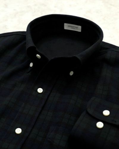 “フランネル生地”と言っても、かなり毛足の短い微起毛なので、ビジネスシーンでも着用できるすっきりした印象の生地です。色味を抑えているので、ビジネスカジュアルのスタイルでお仕事をされる方にもおすすめのネルシャツになっています。