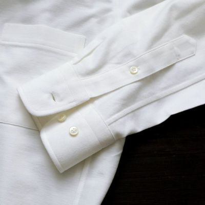 ハリコシが出るように編み上げた生地なので、布帛シャツのように見えますが、ニットシャツなので、ご自宅の洗濯機で洗ったら、そのまま干せば、アイロン掛けせずに着用いただけます(タンブラー乾燥は縮みの原因になりますので、お避けください)。着ていないときも、ノーアイロンシャツでノンストレスにお過ごしいただけます。