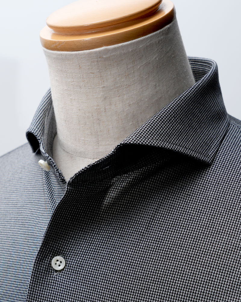 襟型は、ノーネクタイでも首元がエレガントに見える「カッタウェイ」にしています。
