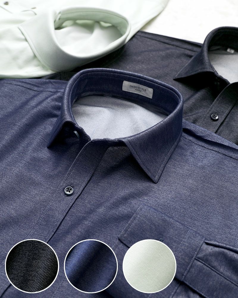 柔らかく、ほどよいツヤ感のあるデニム調ニット生地なので、身体を包み込むやさしい着心地なのに、ドレスシャツらしいツヤ感もあるので、お仕事シーンにも馴染みます。