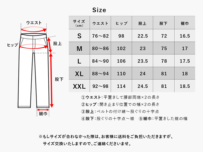 ※「身長170cm/体重75kg」のスタッフは、「Lサイズ」サイズのパンツを着用しております(普段のシャツ着用サイズは、「L(レギュラー)」です)。