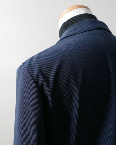 見た目にはニット生地だと分からないほどハリツヤあるニット生地でお仕立てしているので、ふわっと柔らかく、シワになりにくいイージーケアジャケットになっています。生地が自然に伸縮するので、動体設計と相まってノンストレスな着心地をサポートします。