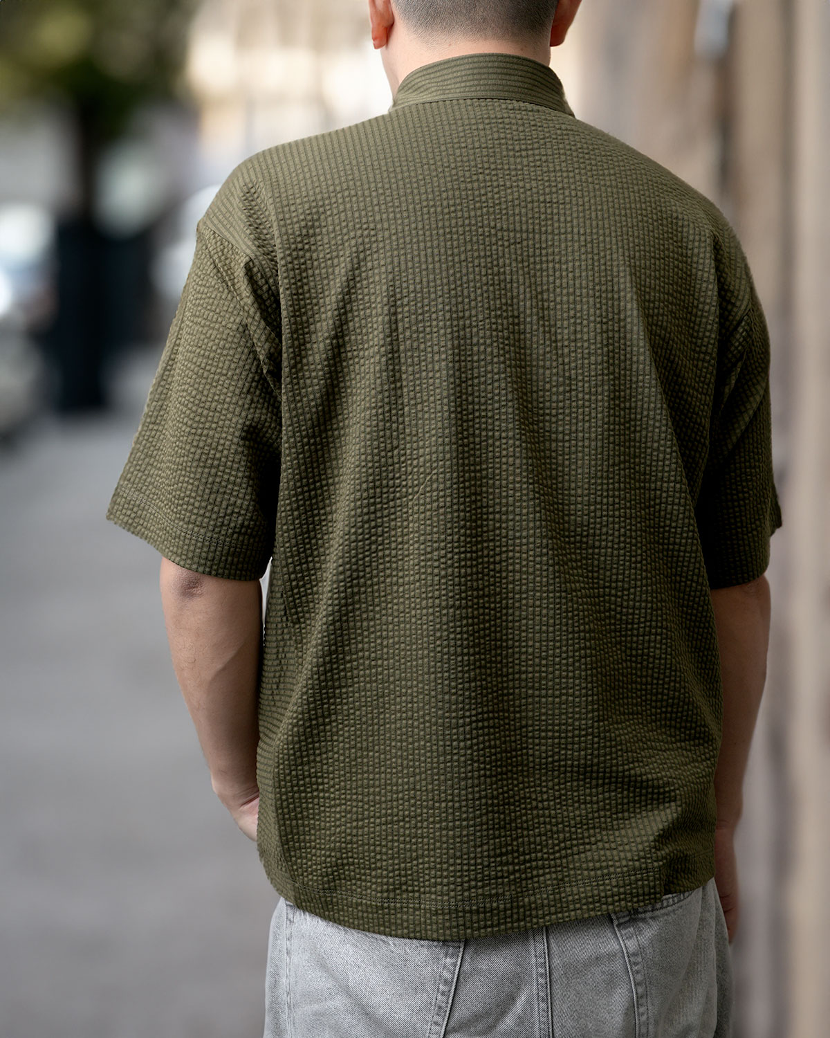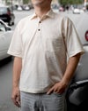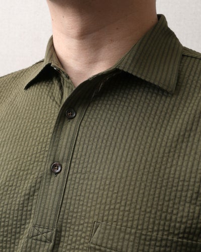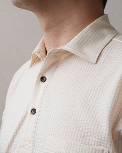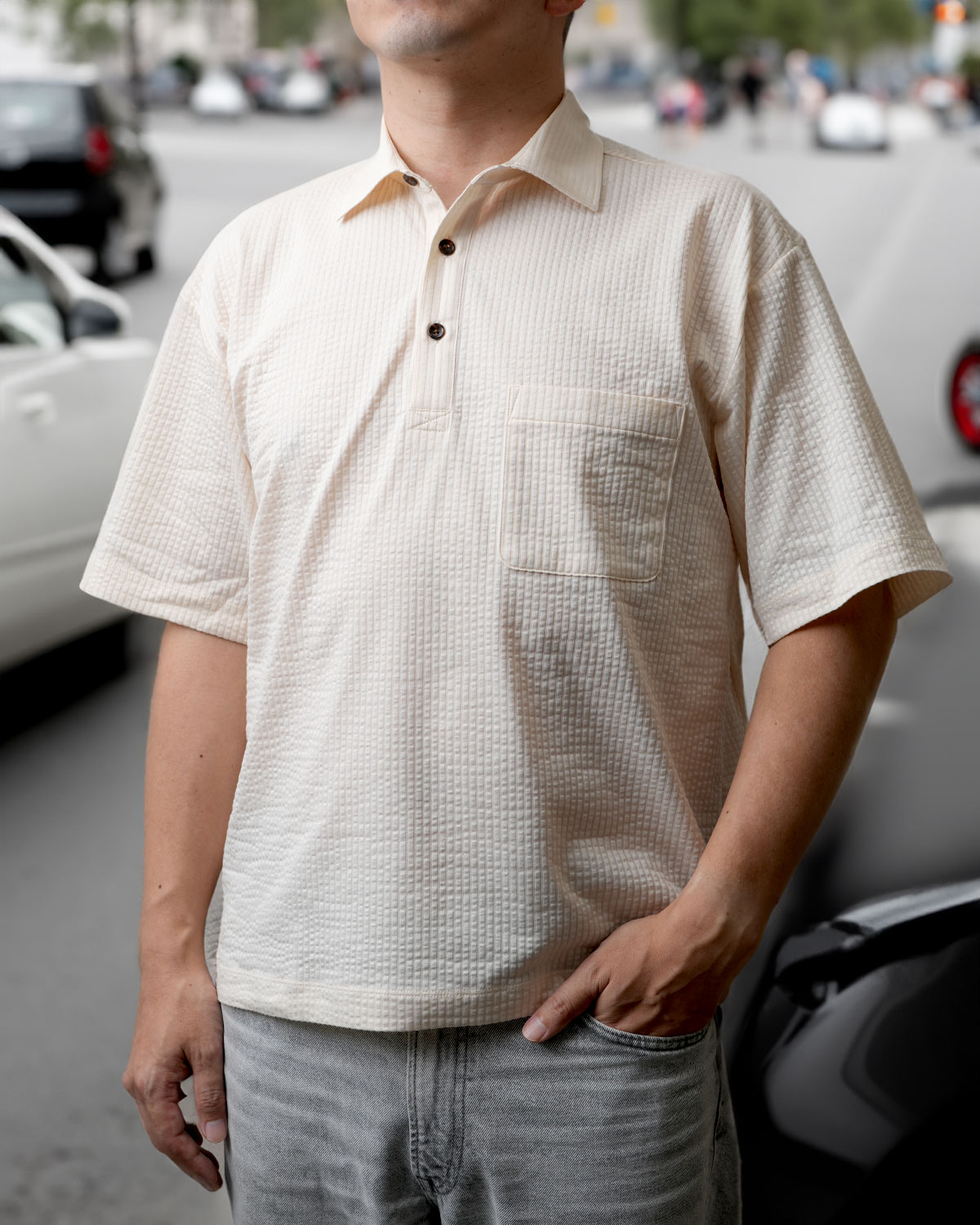 夏らしいシアサッカー生地を使い、汗ばむ季節もさらりと心地よく着られるポロシャツに仕立てました。
