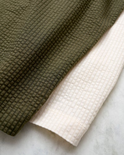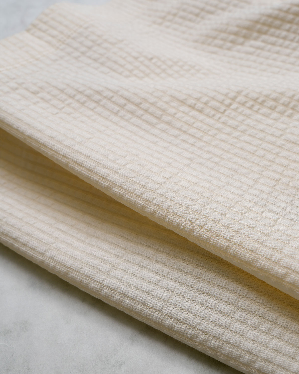 白ほど強くなく、ベージュほど重くない。エクリュは、夏の装いにやわらかな清潔感を添えてくれる上品なカラーです。シアサッカー特有の凹凸感と相まって、肌離れのよい涼しげな印象に。