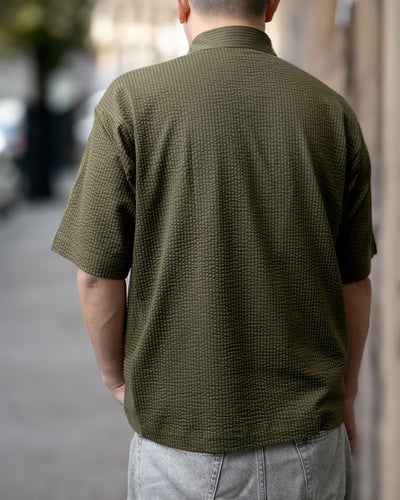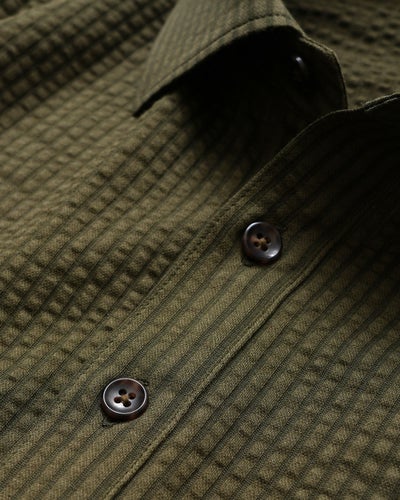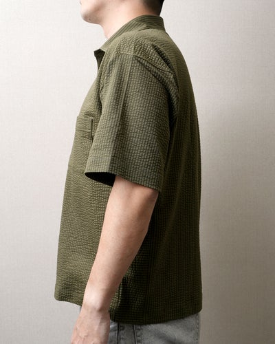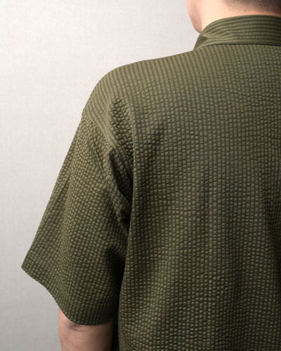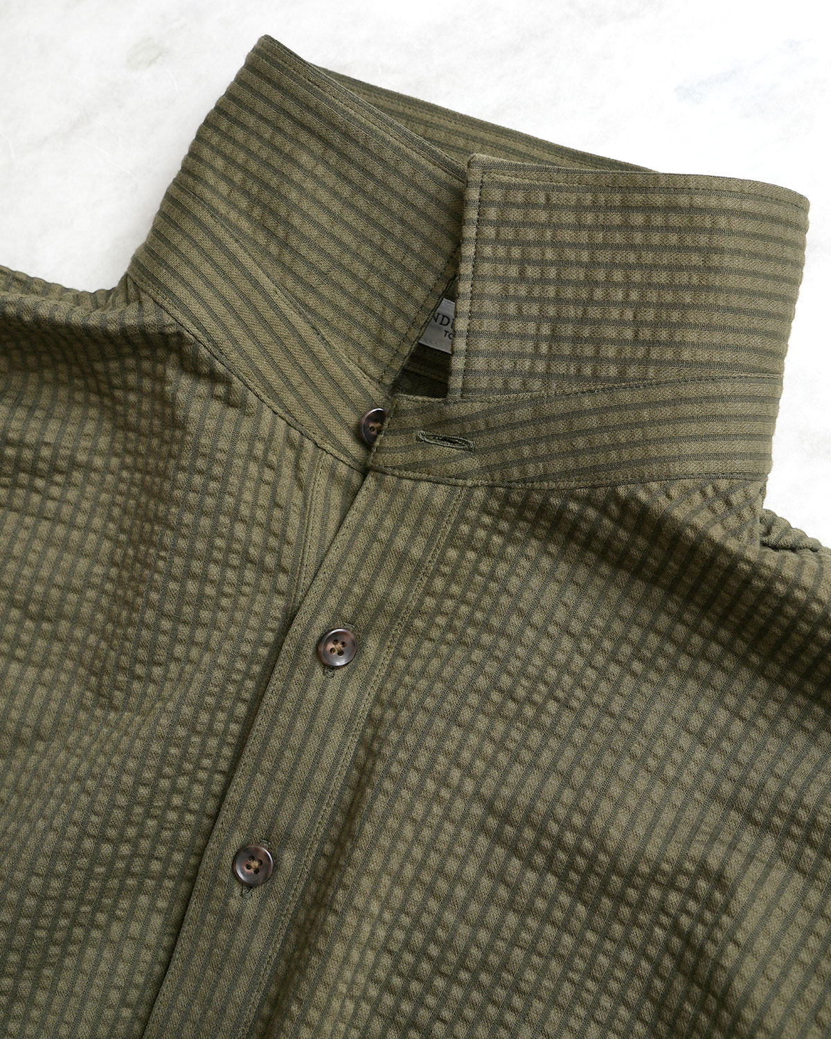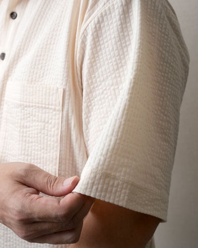 シアサッカーは、夏の人気生地ですが、このシャツにはシアサッカーの中でも、織り生地ではなく編み生地、つまりニットでシアサッカーの凹凸感を表現した生地を採用しています。