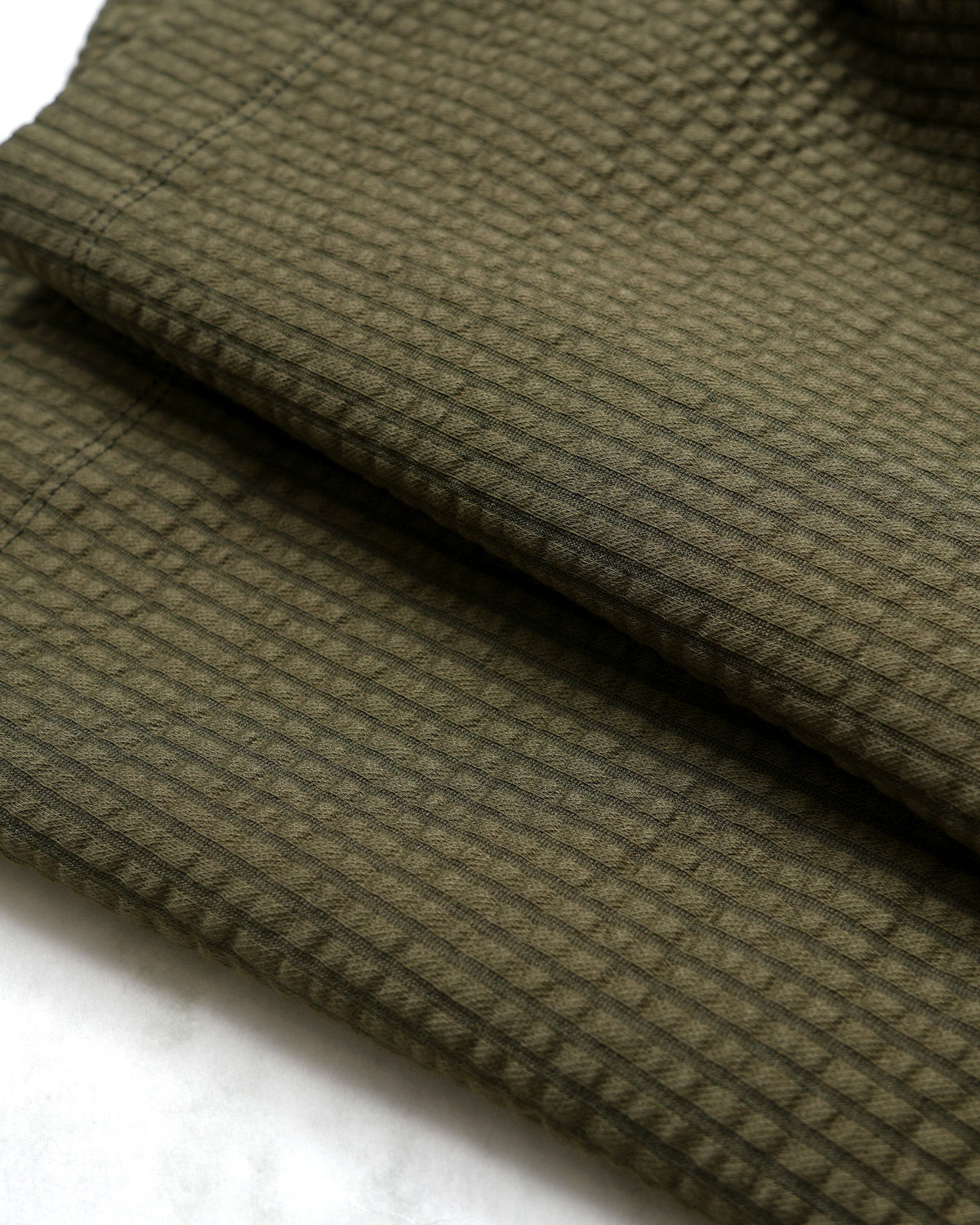 シアサッカーの軽やかな表情によって、ミリタリー感が強くなりすぎず、夏らしく品のある印象に仕上がります。