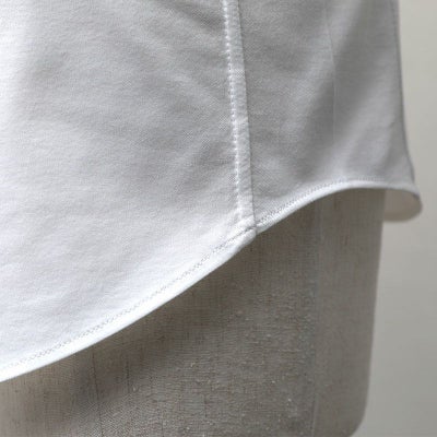 一般的なシャツは、前身頃と後身頃を縫い合わせるだけなので、身体の側面のためのパーツがあることは少ないのですが、INDUSTYLEのシャツは前身頃と後ろ身頃の間を、1枚の長いパーツで繋いでいます。