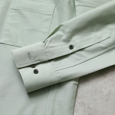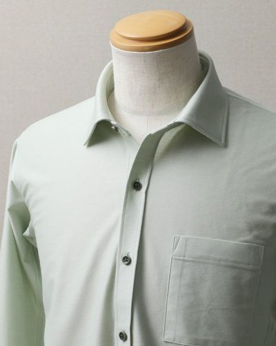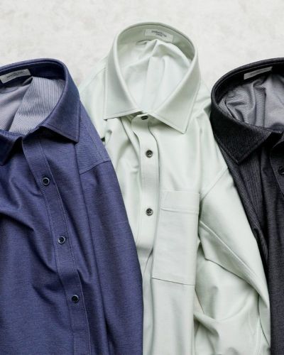 ハリコシが出るように編み上げた生地なので、布帛シャツのように見えますが、ニットシャツなので、ご自宅の洗濯機で洗ったら、そのまま干せば、アイロン掛けせずに着用いただけます(タンブラー乾燥は縮みの原因になりますので、お避けください)。着ていないときも、ノーアイロンシャツでノンストレスにお過ごしいただけます。