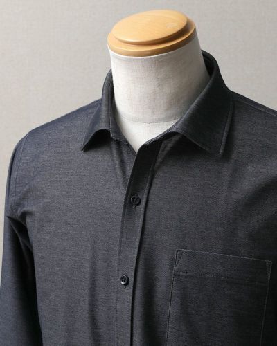 柔らかく、ほどよいツヤ感のあるデニム調ニット生地なので、身体を包み込むやさしい着心地なのに、ドレスシャツらしいツヤ感もあるので、お仕事シーンにも馴染みます。