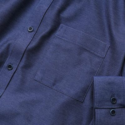 前立ては、トラッドなデザインのプラケットフロント(表前立て)。定番のドレスシャツよりもほんの少し前立てを細くしているので、シャツ1枚スタイルや、ジャケットOFFで着用した時に、スタイリッシュな印象に見えるデザインにしています。