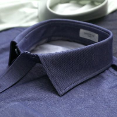 襟型は、デニムシャツのカジュアルな印象に合わせて、定番のワイドカラーよりもやや小ぶりな「ショートポイントワイド」にしました。ボタンダウンだとカジュアルになりすぎてしまうところを、ワイド系の襟にすることで、きちんと感をアップさせました。