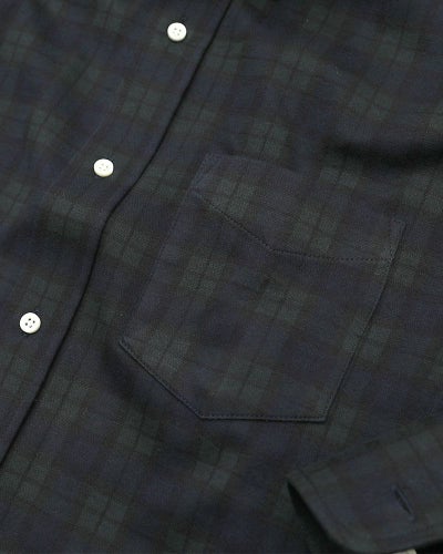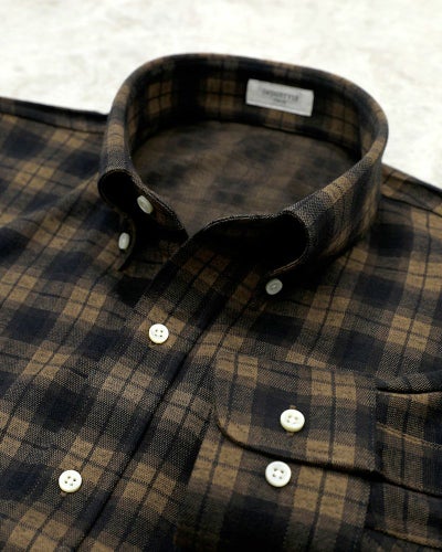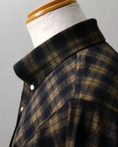 “フランネル生地”と言っても、かなり毛足の短い微起毛なので、ビジネスシーンでも着用できるすっきりした印象の生地です。色味を抑えているので、ビジネスカジュアルのスタイルでお仕事をされる方にもおすすめのネルシャツになっています。