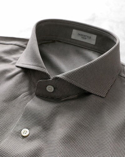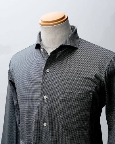 襟型は、ノーネクタイでも首元がエレガントに見える「カッタウェイ」にしています。