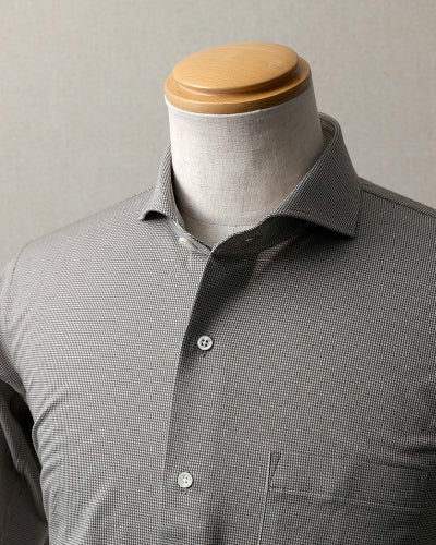 ハリコシが出るように編み上げた生地なので、布帛シャツのように見えますが、ニットシャツなので、ご自宅の洗濯機で洗ったら、そのまま干せば、アイロン掛けせずに着用いただけます(タンブラー乾燥は縮みの原因になりますので、お避けください)。着ていないときも、ノーアイロンシャツでノンストレスにお過ごしいただけます。