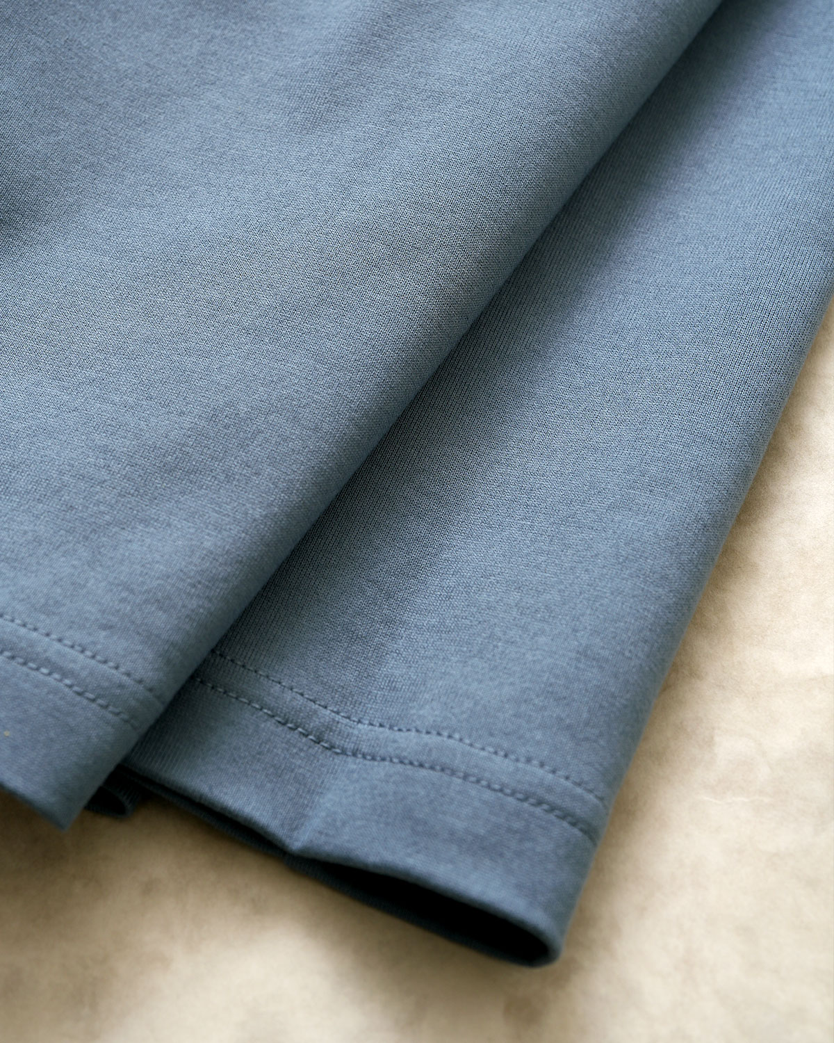 深みのあるブルーに、都会的なグレーを一滴混ぜたようなこの色は、1枚での着こなしはもちろん、ジャケットのインナーとして抜群の相性を発揮します。顔色を明るく見せつつ、落ち着いた大人の品格を漂わせる一着です。