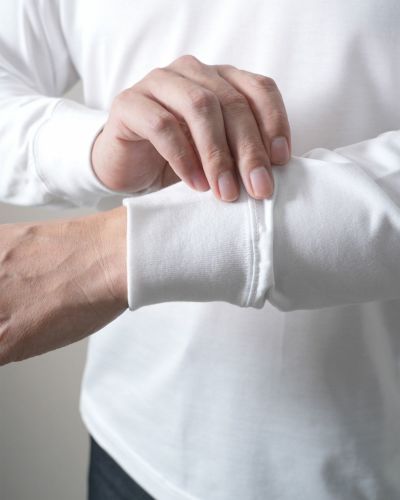 PC作業で腕を動かすとき、資料を手渡す瞬間、ドアノブに手を伸ばすとき―。日常の小さな動作の中で、袖がずり上がらない快適さを実装しました。目立つ工夫ではないものの、一日を通して確かな違いを感じさせるディテールです。