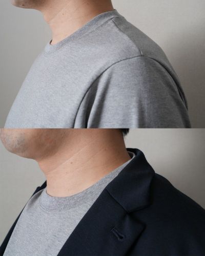 ジャケットと合わせた時に首の後ろの部分が汚れにくいよう、Tシャツの首の後ろ部分を少し高くしています。