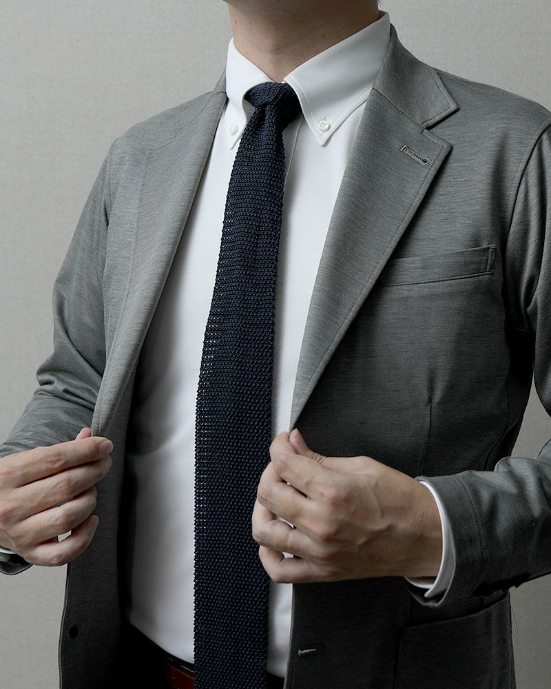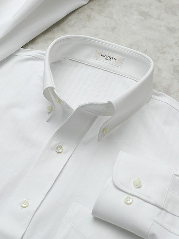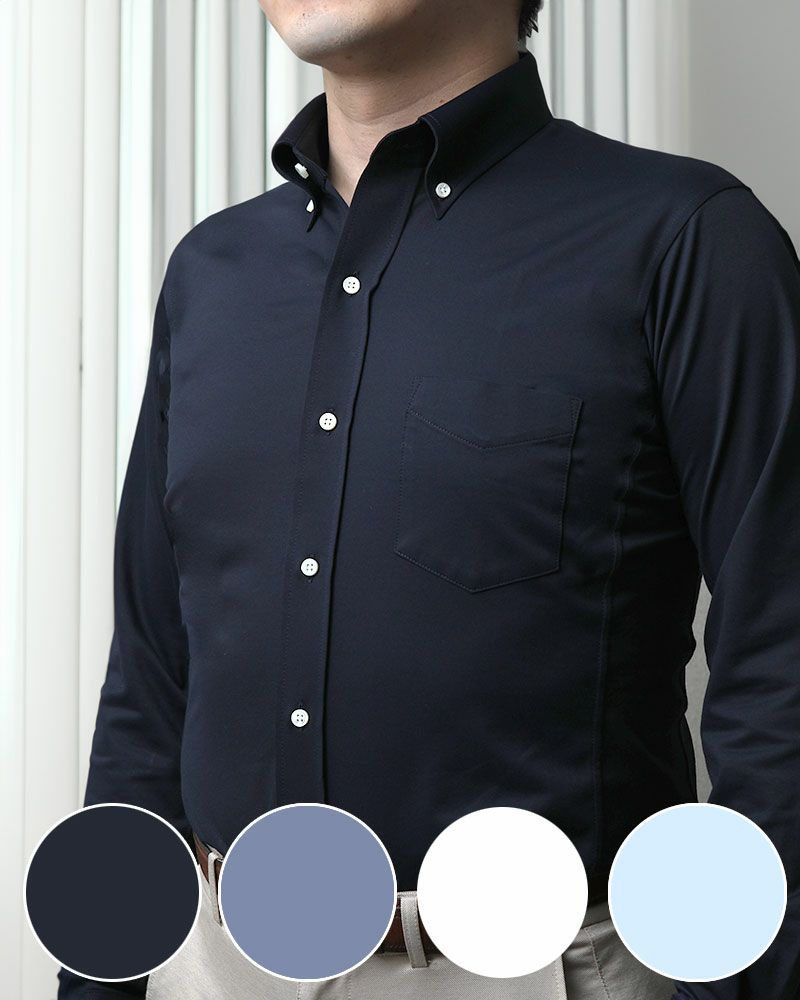 当店のワイシャツは、すべてビジネスシーンに対応した見た目と機能性を兼ね備えたニットシャツです。ニットシャツは伸縮性に優れているので動きやすく、さらに特許技術「動体設計」により、ニットシャツ本来のノンストレスな着心地を最大限に引き出しています。また、ニットシャツはシワになりにくいので、洗濯して自然乾燥すれば、アイロンがけせずに着用いただけます。1956年創業のニットウェア専業ファクトリー丸和繊維工業の自社国内工場で1着1着心を込めて、お仕立てしています。