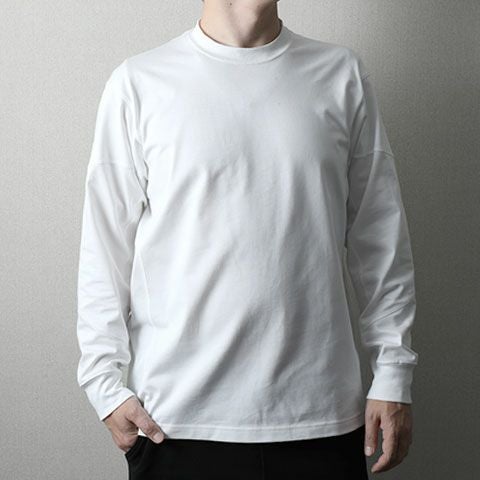 長袖Tシャツ、ブラックとホワイトの2色ご用意しました。 全体的なパターンは、パーカーと同じ考えで動体設計のパーツを主役にしていますが、全身コーディネートをした時に馴染みやすいように、前身は切替をなくしてすっきりさせています。 アメリカ綿のオーガニック糸を使用して、日本の職人がしっかりした生地感に編み立て、それぞれ黒と白に染め上げました。“コシがあってしっかりした生地なのに着心地が軽い”という、動体設計ならではの体験をしていただけるロングTシャツです。 パーカーやジャケットと合わせた時に首の後ろの部分が汚れにくいように、Tシャツの首の後ろ部分を少し高くしています。 首の後ろのリブだけを高くしてしまうと、Tシャツ1枚で着用したときにバランスが悪くなってしまうので、動体設計に基づいて首の後ろ部分のパターンを見直し、見た目が自然で、やさしいフィット感を実現しました。